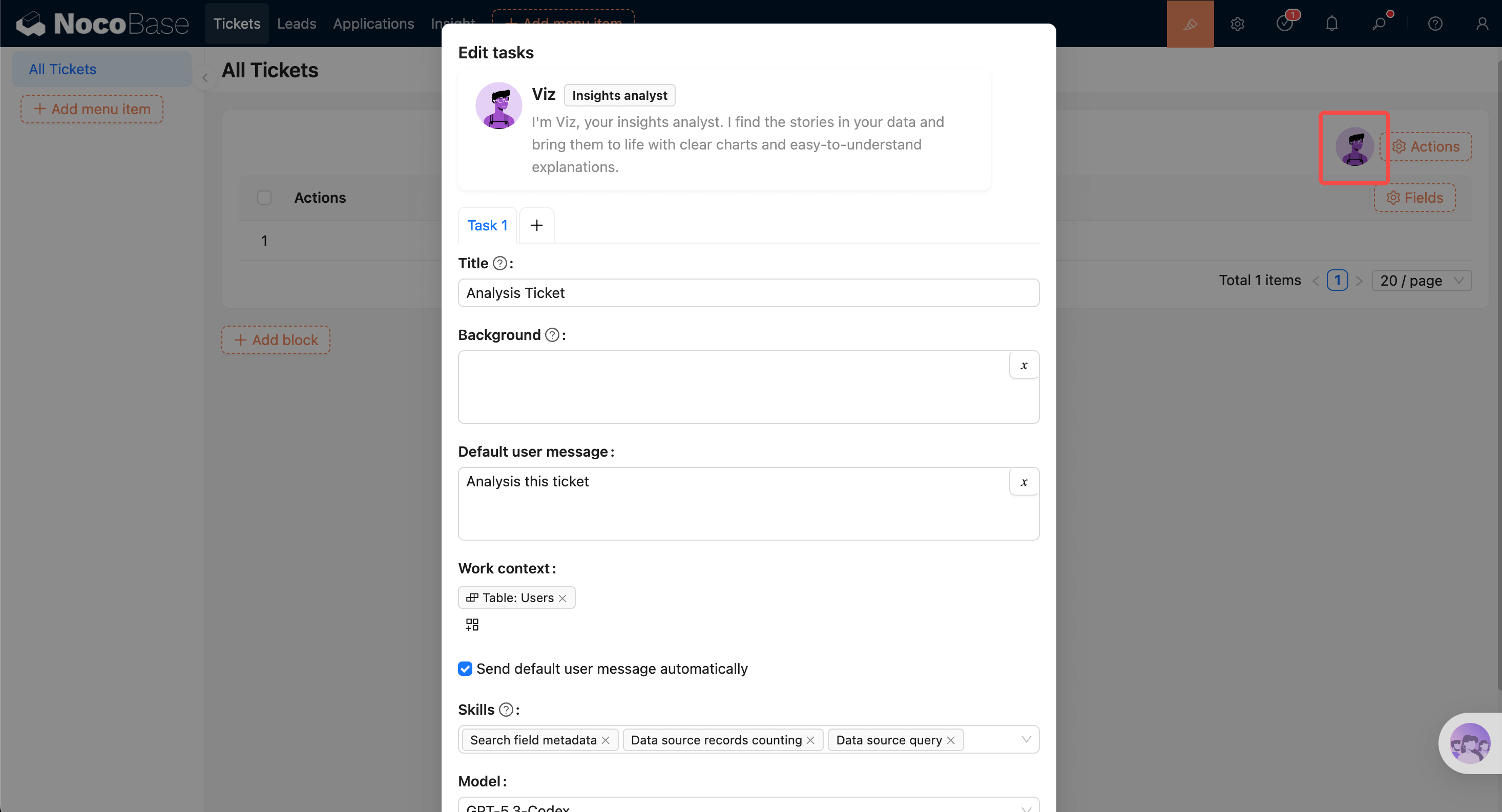 Title. The title appears in the AI Employee task list.Background. This content is used as the system prompt when chatting with the AI Employee.Default user message. It is auto-filled in the input box after selecting the task.Work context, choose default app context information to send to the AI Employee. This works the same as in the chat panel.Skills selector shows skills available to the current AI Employee. You can disable a skill so it is not used for this task.Send default user message automatically controls whether the default user message is sent automatically after clicking to run the task.After tasks are configured, they appear in the AI Employee profile popover and in the greeting message before the conversation starts. Click to run a task.