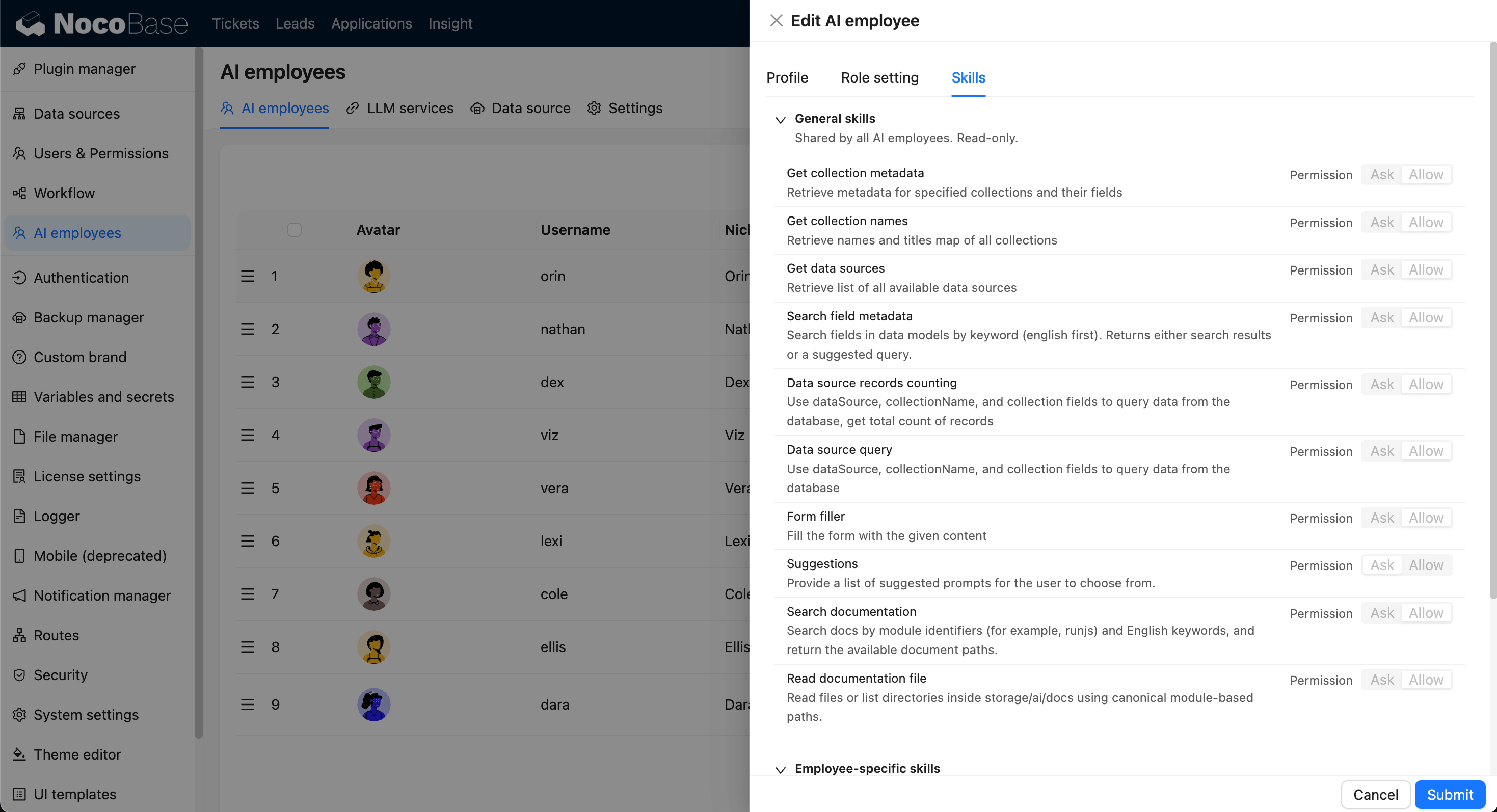 General skills: shared by all AI Employees, read-only.Employee-specific skills: specific to the current employee, usually read-only.Custom skills: custom skills that can be added/removed and configured with default permissions.