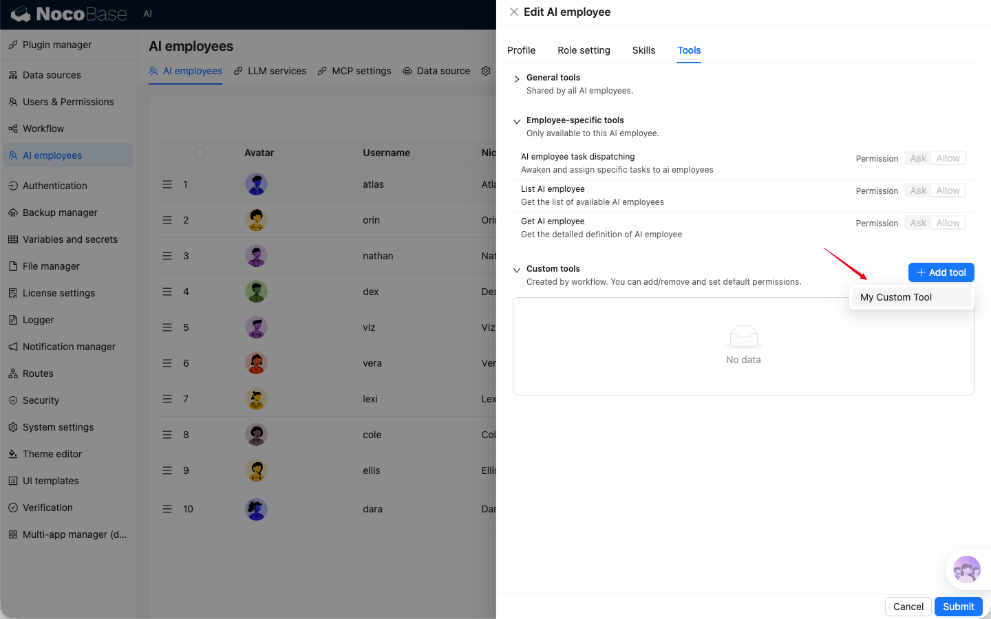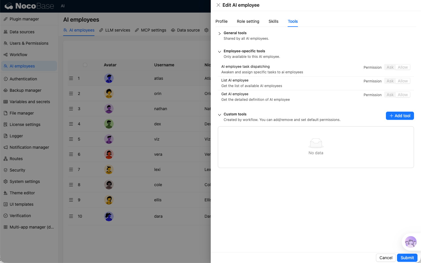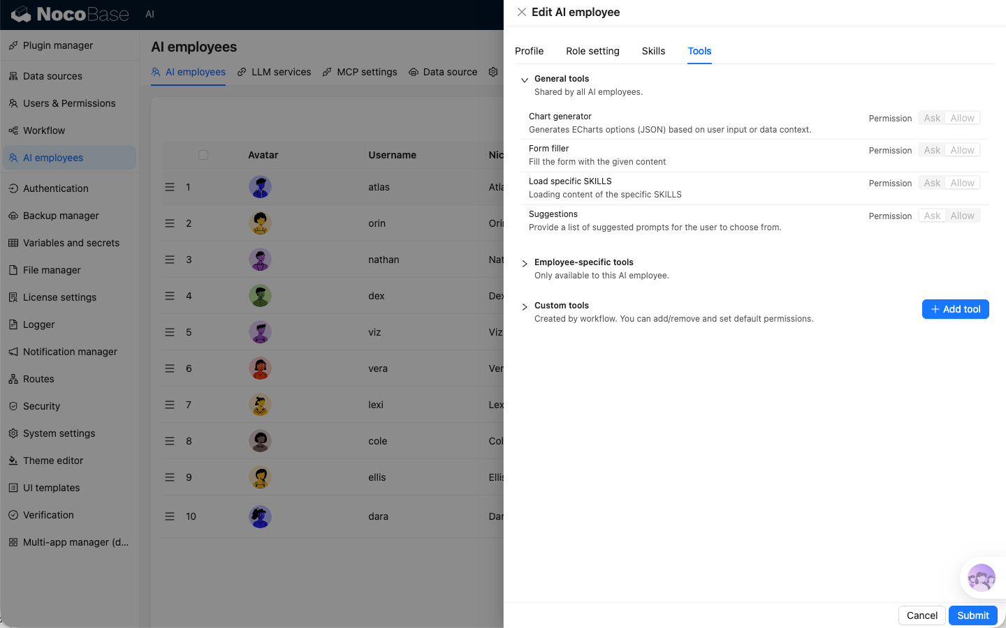 General tools: shared by all AI Employees, read-only.Employee-specific tools: specific to the current employee, usually read-only.Custom tools: custom tools that can be added/removed and configured with default permissions.