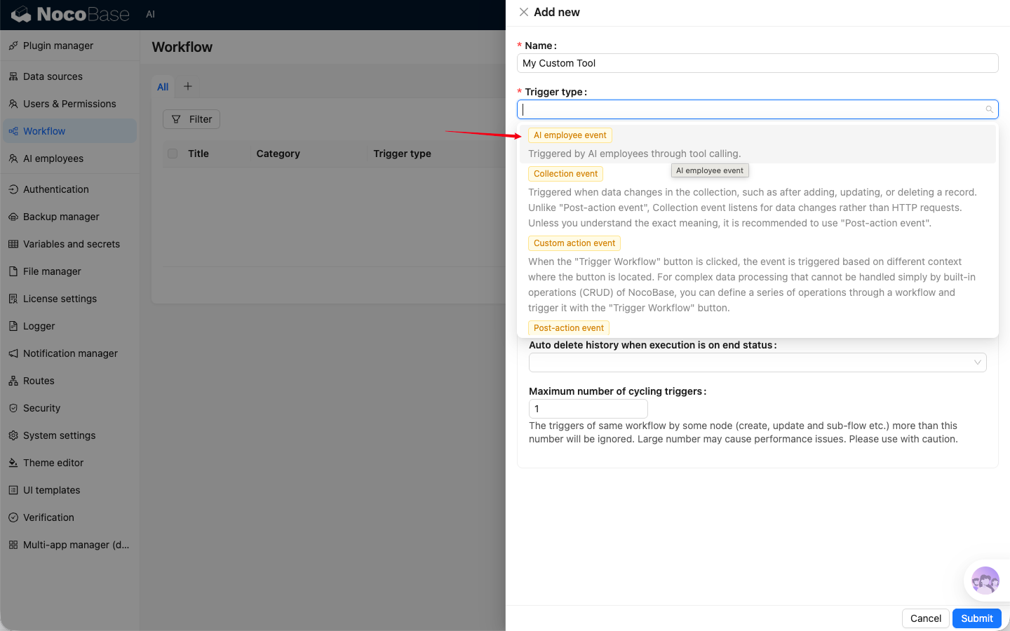 Create a workflow in the workflow module with the trigger type set to AI employee event.