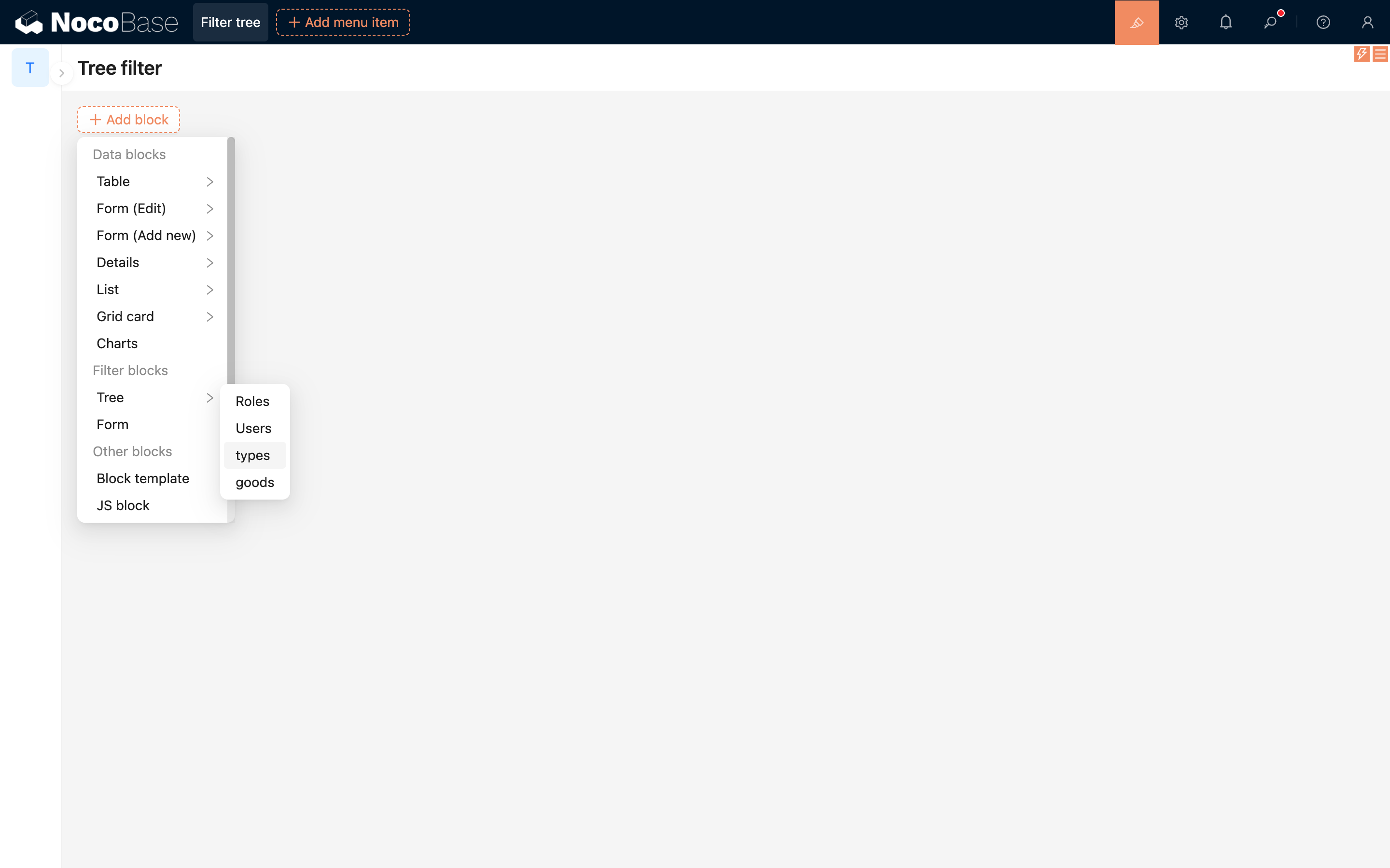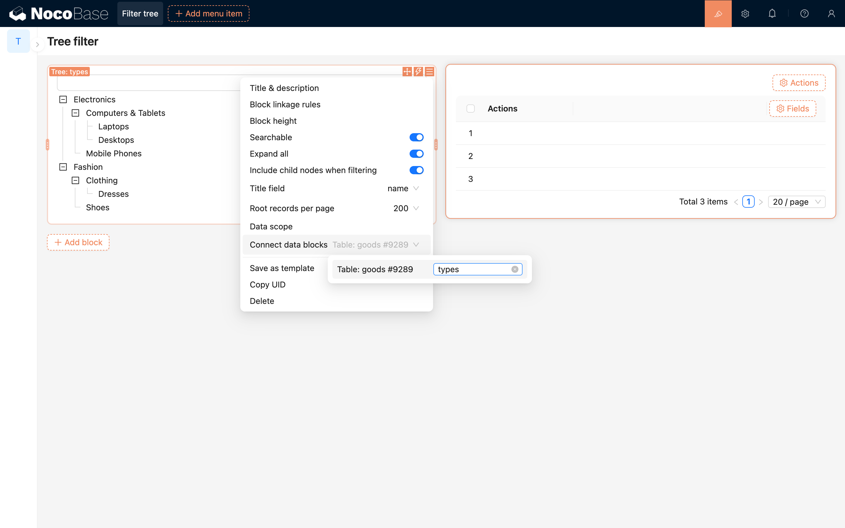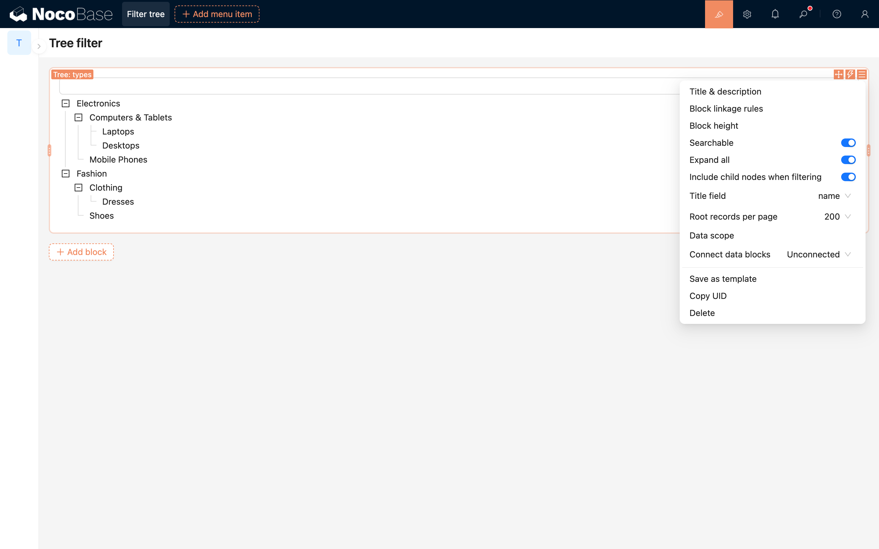 Through the "Connect data blocks" setting, you can link the Tree Filter with table, list, chart, or other data blocks on the page to enable filtering.